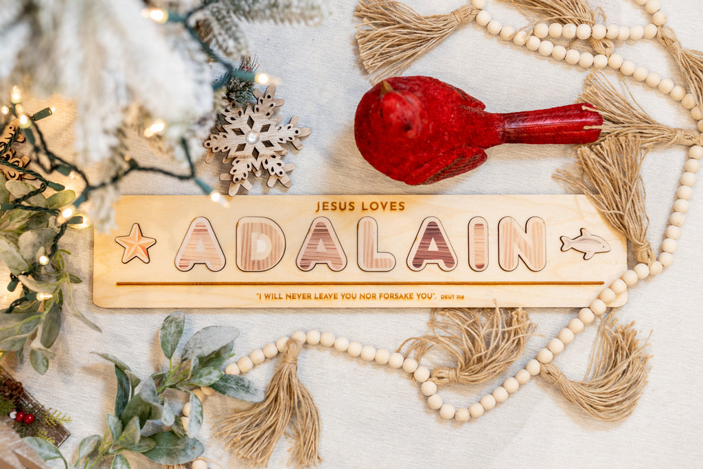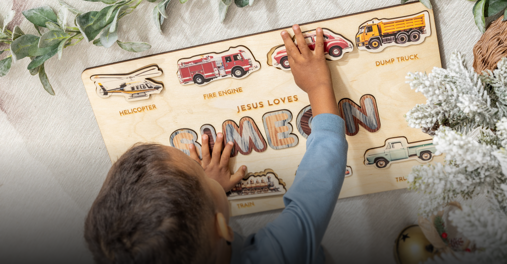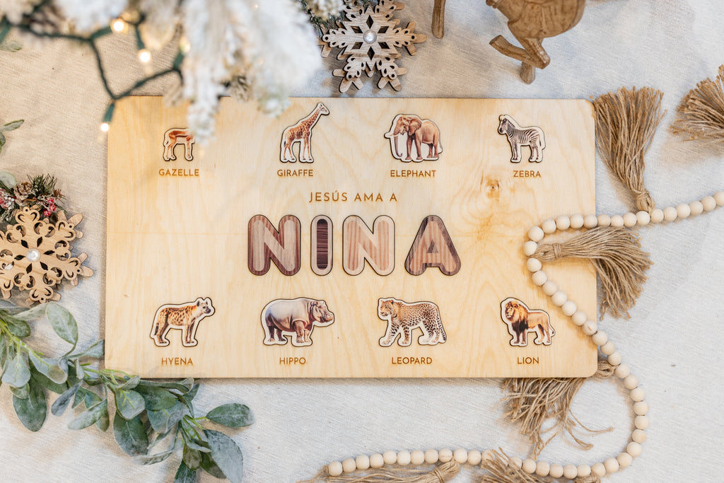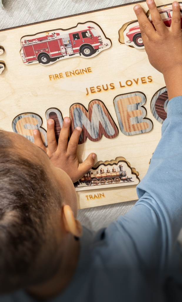 Each puzzle is 12” long, made from sustainable wood, and finished with child-safe, non-toxic paint.
